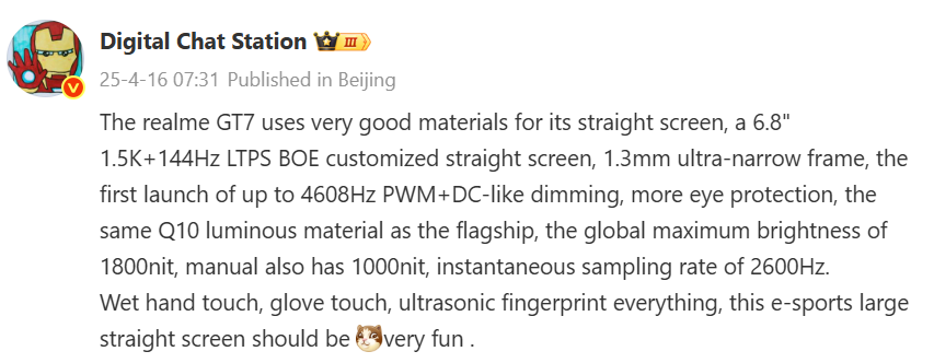 Realme GT 7 has BOE’s Q10 OLED display panel, which supports 1.5K resolution. According to the information, it will have a 6.8-inch LTPS screen, whose bezel will be only 1.3mm. This will give users almost edge-to-edge display experience.